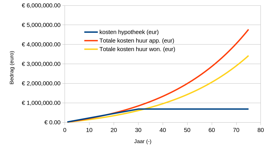 Wat wel een enigszins interessant punt is dat gemaakt kan worden is “je hebt wel na 30 jaar dat vermogen”. Zeker, dat is helemaal waar. Maar wat heb je aan dat vermogen? Immers heeft het je meer gekost dan een woning huren en je kan het niet uitkeren; Het zit in de stenen.