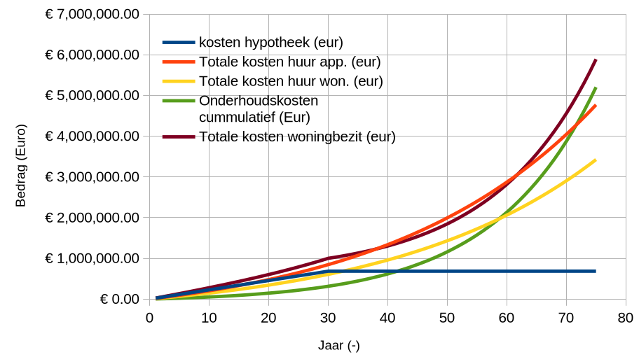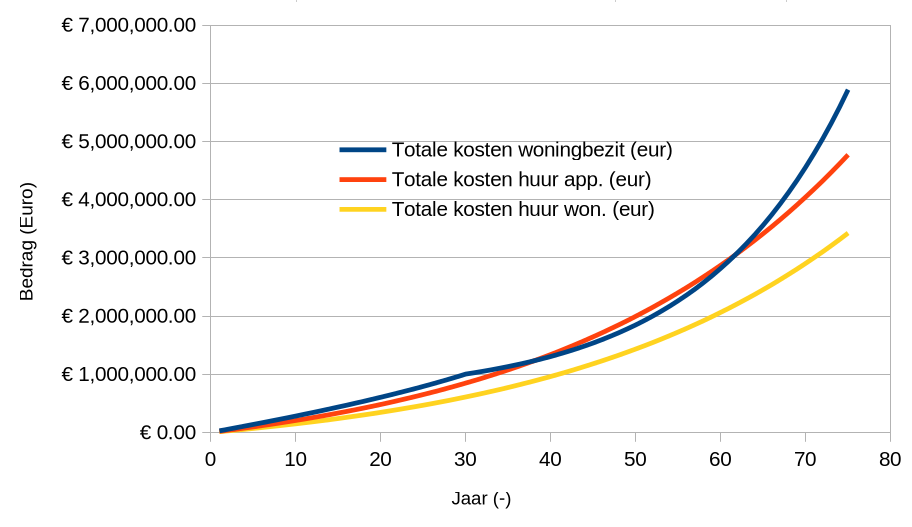 Dan zien we ineens dat kopen altijd duurder is dan een woning huren en dat een appartement huren de eerste 30 jaar goedkoper is, dan even voor 25 jaar duurder is en daarna weer goedkoper dan kopen. Dit komt omdat de WOZ waarde harder stijgt dan de huur. Hieronder een plaatje waarin alles apart is aangegeven.