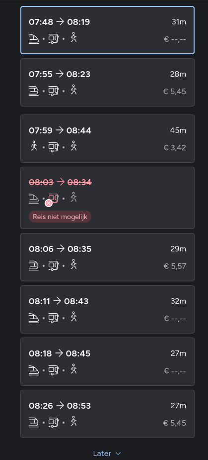 Zoals te zien, er zit nergens een mooie 8,5 uur tussen, 9 uur op zijn minst. Dat is al niet zo handig. Plus je ziet het, een kleine vertraging ergens en je kan al niet meer naar je werk, of er is overwerk, dan hang je. Ziek moet je ook maar niet worden, je moet het uitzitten tot het einde van de dag.