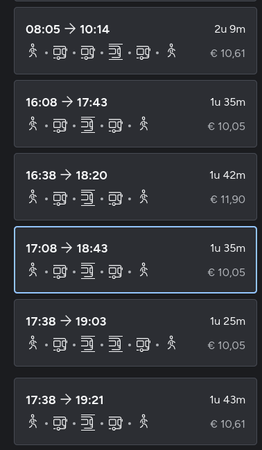 De rit is gelukkig wel betaalbaarder, 7,60 gemiddeld. Je moet wel elke zoveel tijd overstappen en je zit in de spits. Je doet er minstens 90 minuten over.